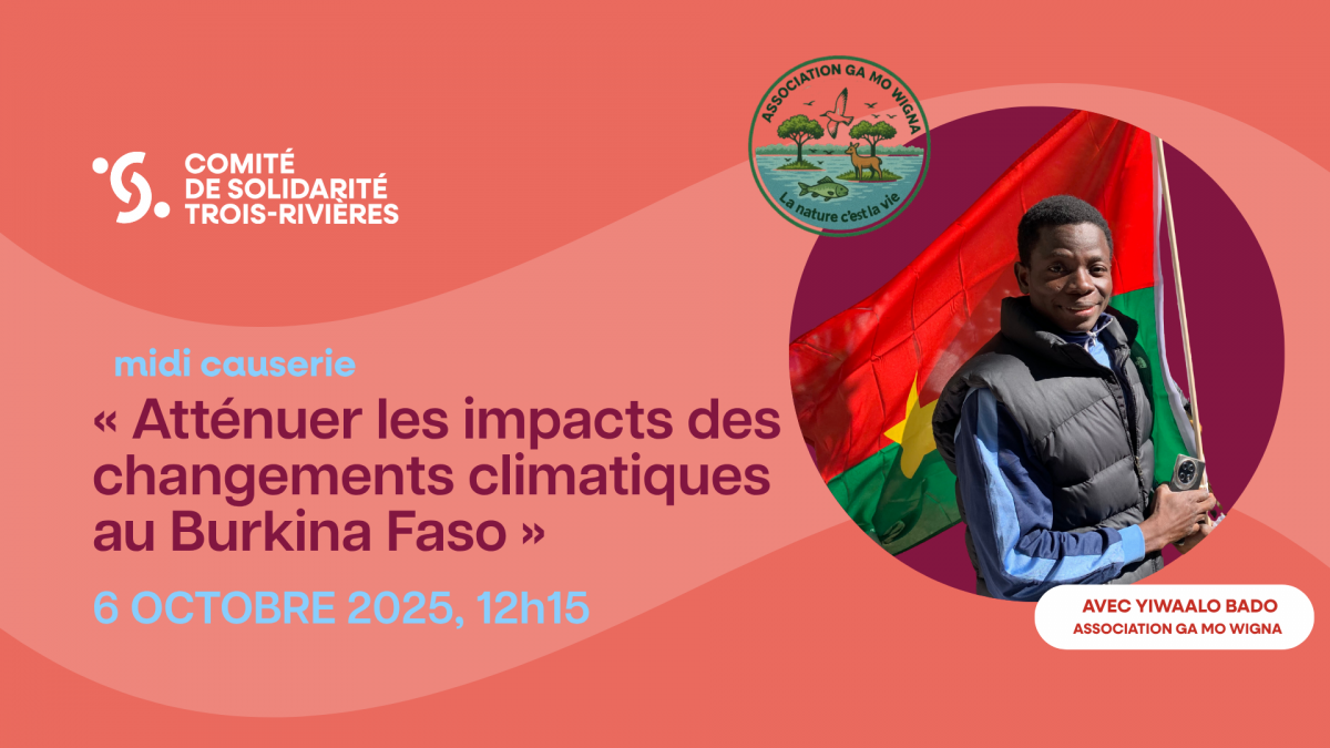 Apportez votre lunch et venez nous rejoindre dans nos bureaux ou en virtuel pour une causerie spéciale avec Yiwaalo Arnaud Gérard BADO, animateur de Ga Mo Wigna. Il présentera les résultats d’un projet de coopération climatique internationale mené depuis près de 10 ans avec le Comité de Solidarité/Trois-Rivières et l’UQTR. Quand savoirs traditionnels, innovation technologique et solidarité internationale s’unissent, c’est tout un monde d’espoir qui s’ouvre!